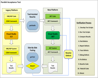 | The defining feature of this methodology is a staged, iterative approach and its use of a sophisticated modernization tool, gmStudio, to help rewrite the legacy source code according to the project team’s unique requirements. Used properly, the Tool-Assisted Rewrite methodology produces a repeatable upgrade solution for your systems that integrates tool-generated code, hand-written code, and third-party components. The methodology balances automated and manual work to improve accuracy, efficiency and scalability while allowing high-visibility of progress and full control over results. | ![]() |