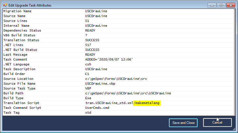 you may update or ignore the custom metalang file on a task by task basis by setting the Translation Script field: