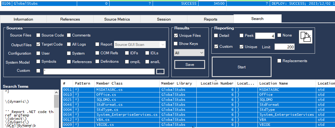 Section titled “Removing Spurious Stub Projects”Searching for ”^}” in the generated GlobalStubs code reports the size of each stub file. If some of these files are found to have only a few records, they are empty stubs.