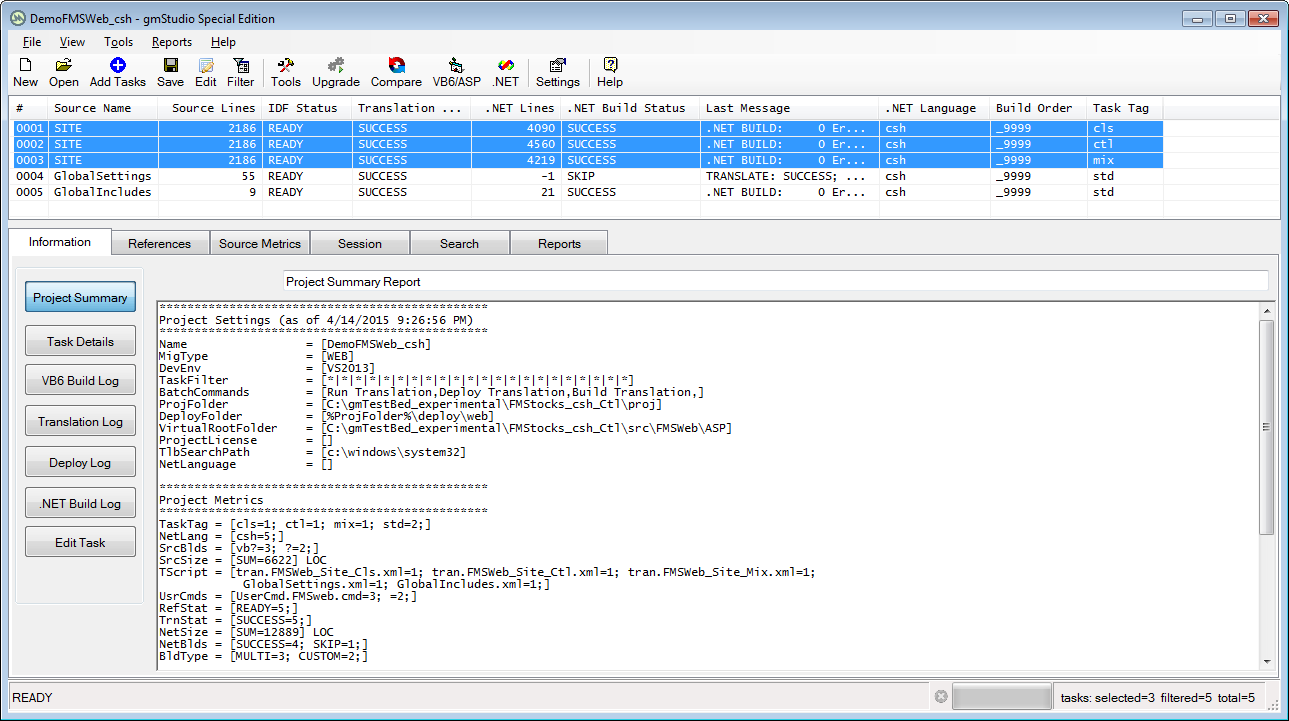 Note: it is somewhat unusual for a gmStudio project to have different upgrade configurations for the same source code, but it makes it easy to compare the results of each configuration by selecting any two upgrade tasks and clicking the compare button. However, beware that all three of these tasks share the same deployment folder and when you deploy the results they will overwrite the content of the deploy folder.