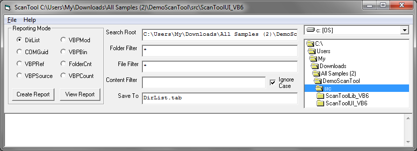 Section titled “Overview”ScanTool is a desktop application that scans and analyzes files and directory trees and generates useful reports from the analysis of the files. For example, one report shows the structure and size of VB projects in the directory tree. Another report shows information about COM components referenced by the VB code. The program has an object-oriented design, with a different class handling each type of report.