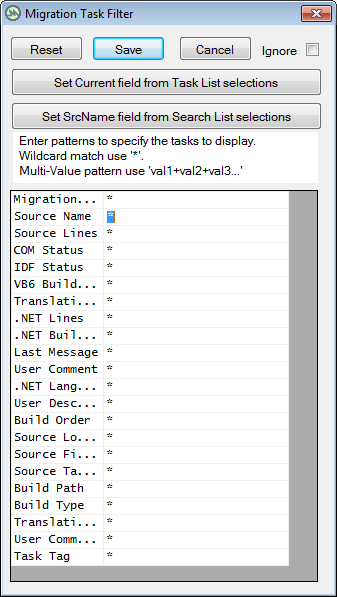Section titled “Task Filter Form”The Task Filter Form is used to specify which tasks should be displayed in the Migration Project Panel. This is helpful when you wish to work with a subset of the migration units.