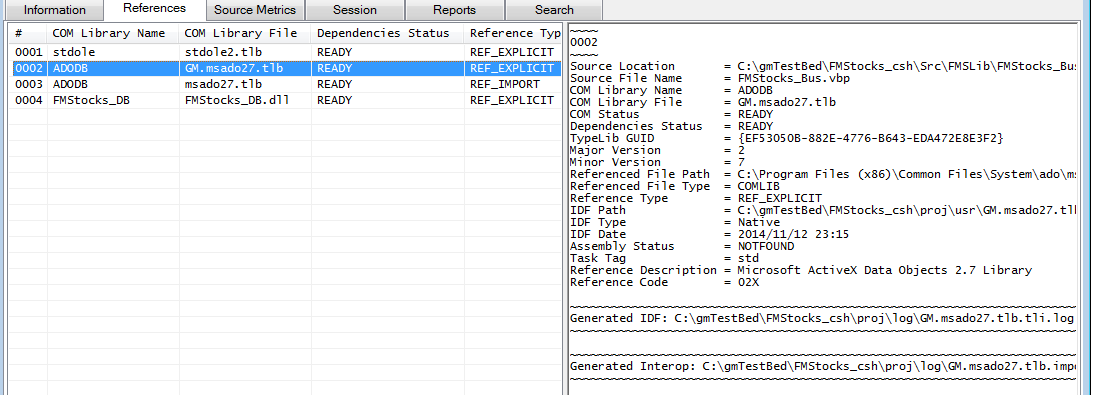 - Clicking a list item will select that item and cause its details to be displayed in the right-side pane. The details include a one-up report of the reference information and logs relating to creating the interface description file and Interop assembly for the reference.