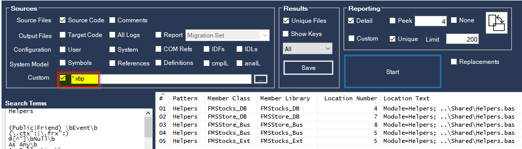 On the left, under the search option box is the [Start] Button. Clicking [Start] saves the search pattern list to CodeScanList.txt file and then starts the search process. Matching records are written to the Search Results list.
