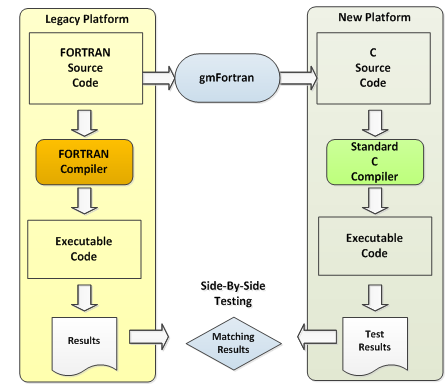 - Correctness. Since gmFortran compiles FORTRAN to C, i.e., performs both a syntactic and a semantic transformation of FORTRAN to C, the translated C code is both compilable and “correct,” that is, it yields reproducible results -which is not the case with other translation tools which are limited to simple syntax transformations that yield partial or incorrect translations. The compiler has been tested on several platforms with Version 2.0 of the FORTRAN compiler Validation System from the FederalSoftwareTestingCenterand passed the test at the full validation level on all platforms.